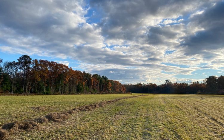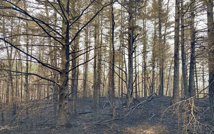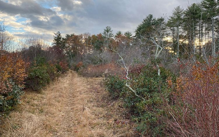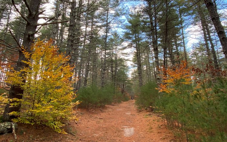 Old town roads now serve as wide, flat hiking trails that wind through tall pine woods, some charred as a result of a fire in 2023. Highlights include a historic cemetery, views of the Queen’s River, and a long, open hayfield that is actively managed by a local farmer. Two small stone foundations lie just off the main trail, hidden in plain sight.