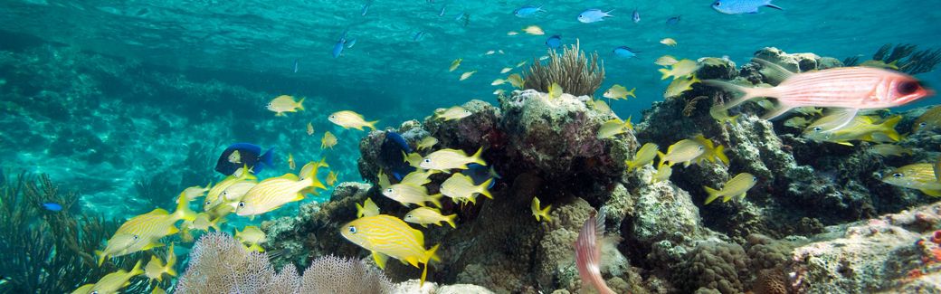 (ALL INTERNAL RIGHTS, and LIMITED EXTERNAL USES) Reef fish congregate in the shallows.  Shot in Exuma Cays Land and Sea Park, Bahamas. The Nature Conservancy works closely with partners such as the Bahamas National Trust and the government of the Bahamas to protect the marine habitat of the Exuma Cays and achieve the goal for the long term protection of national parks through the Caribbean Challenge.  PHOTO CREDIT: © Jeff Yonover