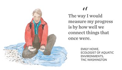 Healthy estuaries are like safe harbors for baby salmon, offering the food they need to grow strong enough to survive a long journey to the ocean. But estuaries all over the world are also places where people have built dikes to push back the sea and levees to confine the rivers, making space for everything from cities to farm fields. And so like many others, the Stillaguamish delta is a changed estuary. This is why scientists like TNC’s Dr. Emily Howe are reconnecting life-giving tidal and river flows across estuarine deltas like the Stillaguamish. Over the next few years, the Stillaguamish Tribe of Indians, a sovereign federally recognized tribe, and TNC will reconnect a network of marsh channels across TNC’s 4,000-acre Port Susan Bay Preserve and nearly 800 newly acquired acres by the Tribe, providing young Chinook salmon with an abundance of new places to feed.