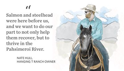Even if there’s no simple fix, wherever salmon live there are ways to turn things around. This is why TNC coordinates with partners and ranchers like Nate Hull. The Hull family runs the Hanging T Ranch where they are implementing restoration projects that will improve conditions for adult salmon returning to spawn. Restoring lands and waterways along the Pahsimeroi River helps to keep water flowing clean and cold, and adds to ongoing efforts in the Pacific Northwest to help Chinook salmon return in bigger and better numbers.