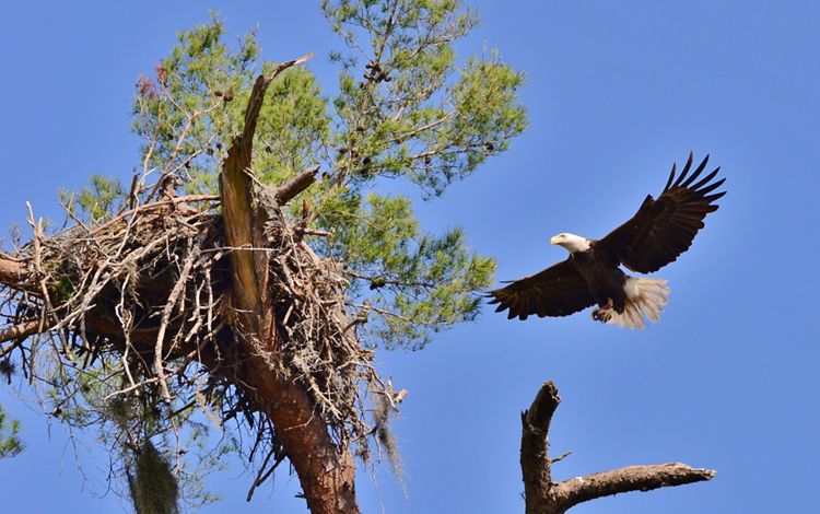 Bald eagle nests are usually about five feet wide and built of a foundation of sticks and the inside, called an eyrie, includes soft materials such as grasses, Spanish moss and other plant debris. To prepare for their clutch of eggs, a pair may add to their nest every year, expanding its width and depth.