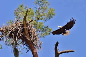 Bald eagle nests are usually about five feet wide and built of a foundation of sticks and the inside, called an eyrie, includes soft materials such as grasses, Spanish moss and other plant debris. To prepare for their clutch of eggs, a pair may add to their nest every year, expanding its width and depth.