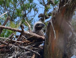 The chicks grow quickly, gaining more than a half-pound a week for the first 10 weeks of life. Then, between 10-12 weeks, they’ll “branch” or start hoping from branch to branch surrounding their nest. This branching behavior alerts eagle monitors like Kevin and Diana that the eaglets will soon fledge, or take its first flight from the nest.