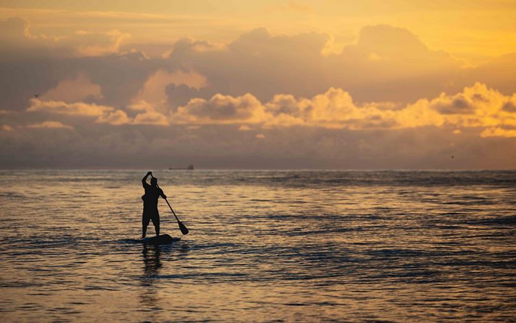 A pair of paddlers navigate calm coastal waters in Tampa Bay, joined overhead by a flock of birds.