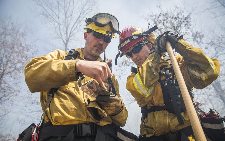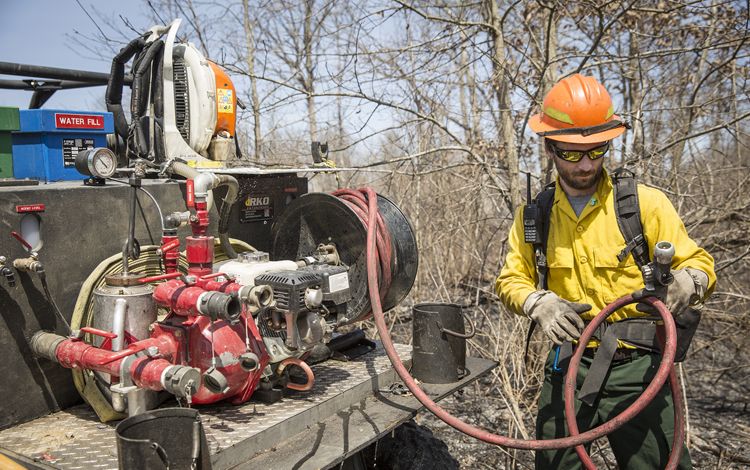 One of the many tasks the fire crew will perform is installing fire breaks—areas without any available fuels such as grass, leaves or branches and woody debris that a fire will not readily cross. Installing a fire break through the woods can present a challenge. “If it’s really thick, you’ll have to initially clear the break with a chainsaw to take out the big stuff, and typically follow up with a leaf blower to blow leaves and other smaller lightweight fuels out of the break,” says Pickett. “We use hand tools for the duff layer, clearing it out with rakes, Pulaskis, or shovels all the way down to bare mineral soil.”