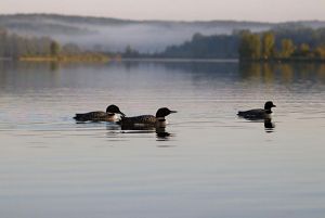 Flora & Fauna: Your Turn // Parent Common Loon approaches the second-born loonlet after refusal from a full first-born, offering a crayfish for feeding on the Torch River in northern Michigan. A pecking order was established during the first days which was honored throughout the summer. © Steven Jessmore/TNC Photo Contest 2023