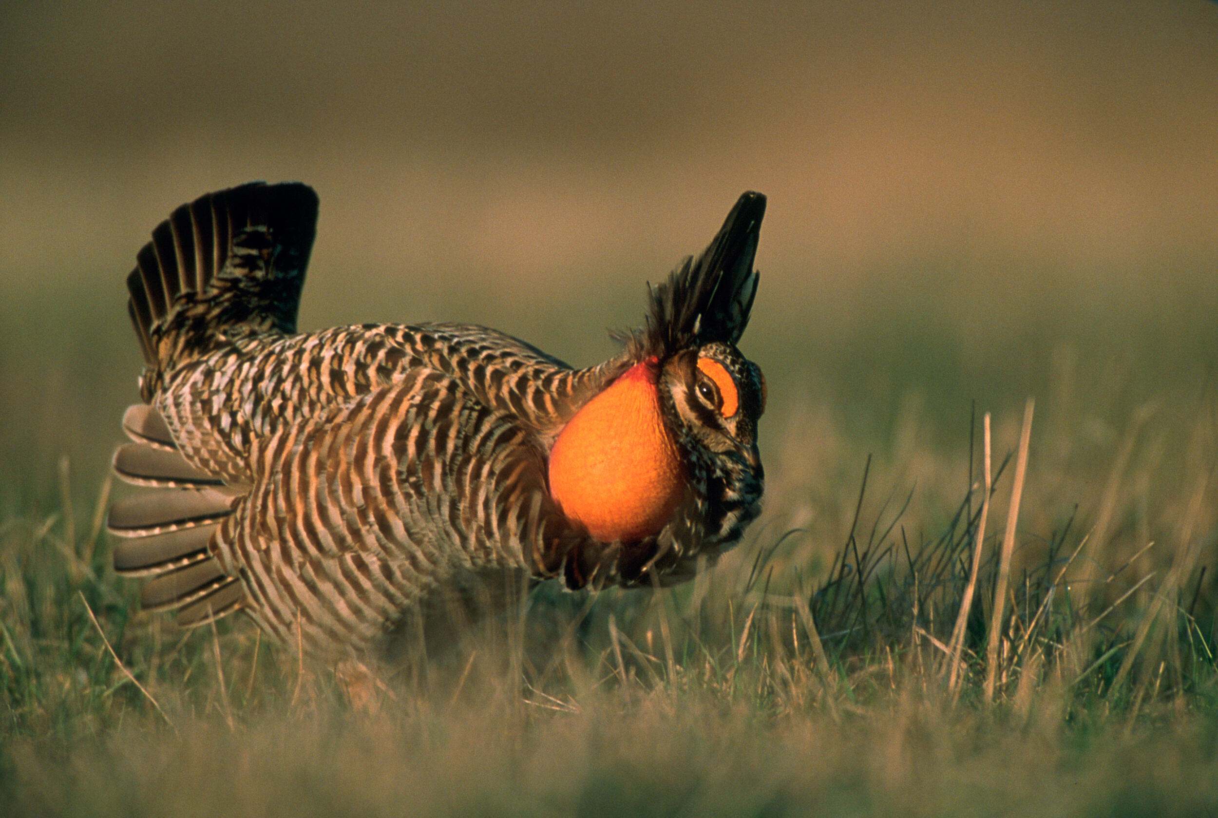 Before sunrise, males begin to take their positions. What follows is a complex performance that is part vocalization, part dance and part show of strength. A male starts by raising the long, pointed feathers on the sides of his neck. These feathers frame the bright orange air sacs that inflate as he prepares to boom. With his wings lowered and tail feathers fanned, he fills the prairie with a deep, resonating call. The sound rolls across the grassland and can travel more than a mile in calm conditions.