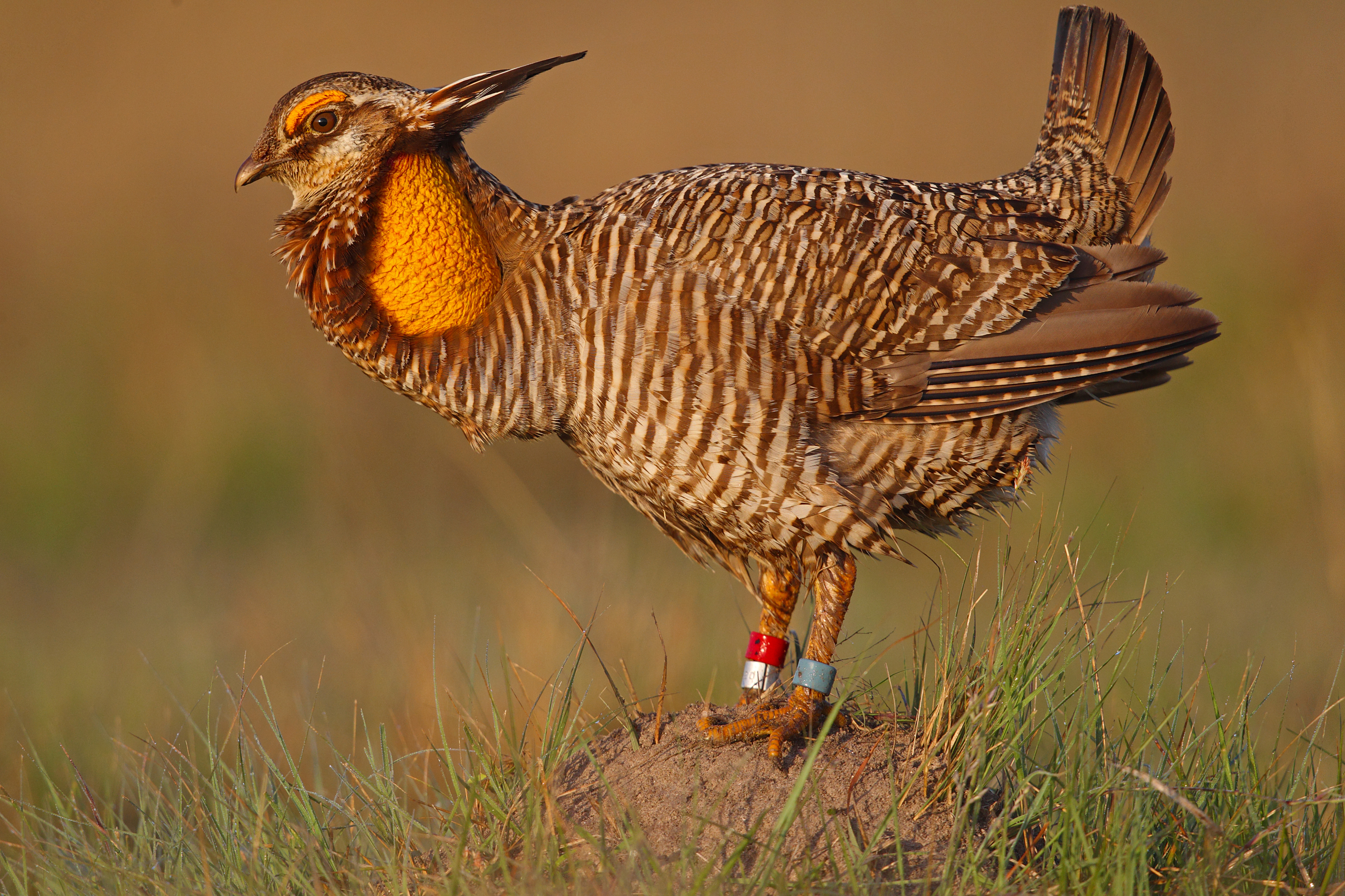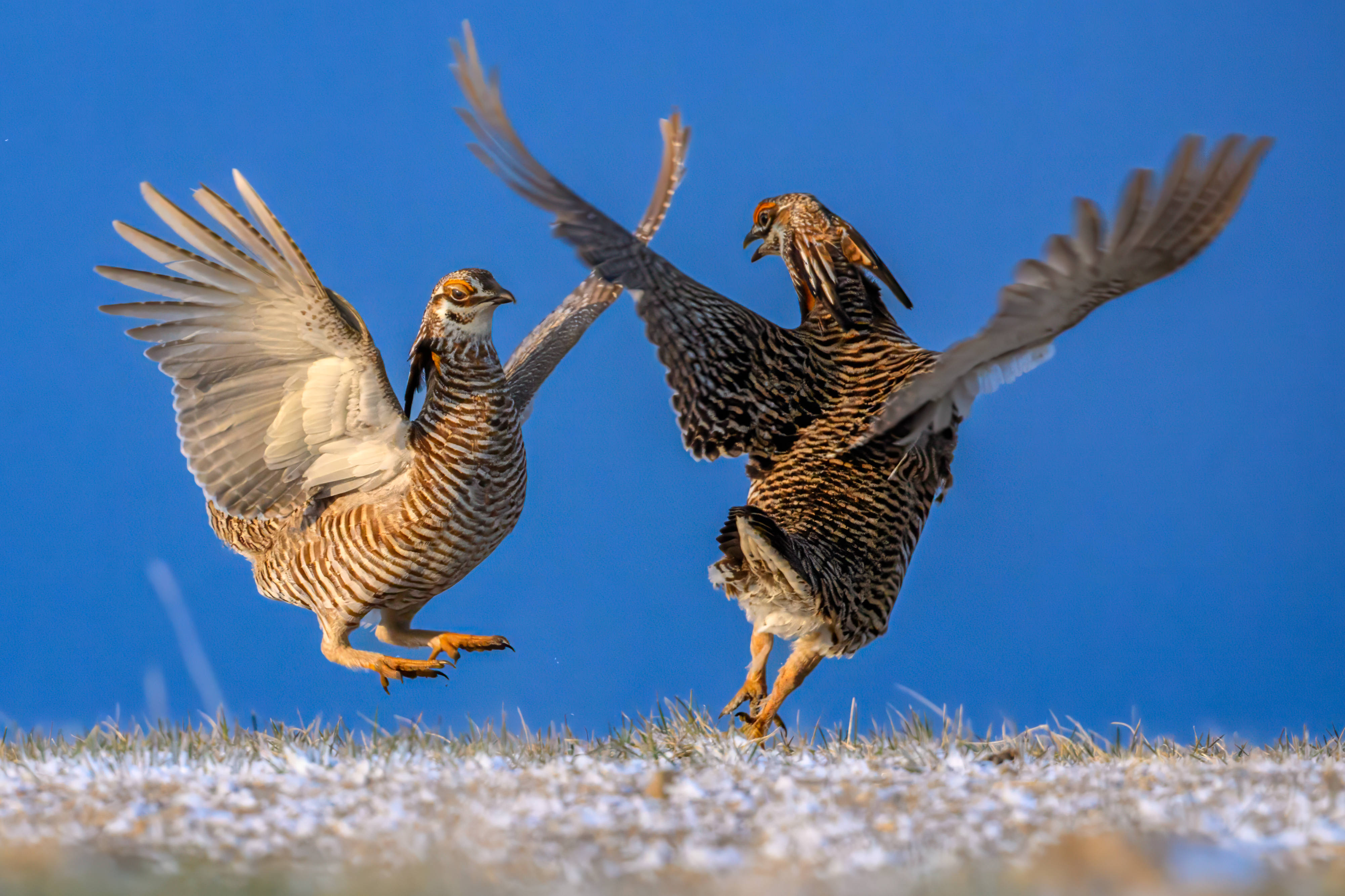 The greater prairie-chicken is one of the most distinctive birds of the tallgrass prairie. Their striking barred feathers, upright neck plumes and bright yellow eyebrows make them unmistakable, but it is their spring courtship display that has earned them fame across the Great Plains.