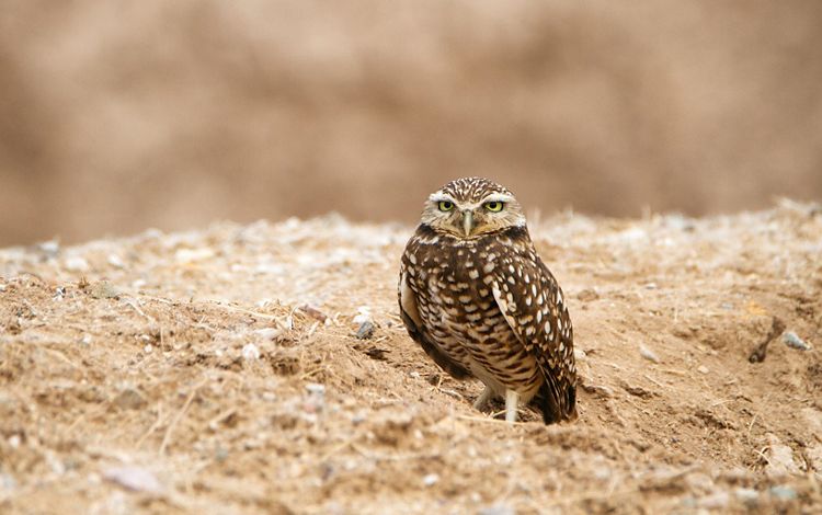 DID YOU KNOW? They are one of the smallest owls in North America and different from most owls in several ways. Burrowing owls nest under ground instead of in trees. They are not exclusively nocturnal; they hunt around the clock, often eating insects by day and catching small mammals at night. They have unusually long legs and spend much of their time on the ground. They also lack tufts of feathers just above their eyes like most owls. While burrowing owls can dig their own nests if necessary, more often they will occupy a hole that has been abandoned by a prairie dog, badger, desert tortoise or other small creature. When building a nest, they often surround it with animal waste to attract dung beetles. This ensures that one of the intelligent bird's favorite foods will be nearby at all times!