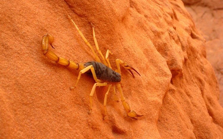 Like other scorpions, this species gives birth to live young that ride on their mother’s back for a week or so before venturing out on their own. The scorpion's common name comes from the brown hairs that cover its body. These hairs help detect vibrations in the soil. They dig elaborate burrows up to 8 feet long, and they emerge from them at night. Though they are large, these scorpions' sting doesn't pack much punch. Their venom is not considered to be highly potent and is mostly dangerous to people with an allergy to it. Like all scorpions, the giant desert hairy scorpion will glow when exposed to an ultraviolet light due to fluorescent chemicals in their bodies.