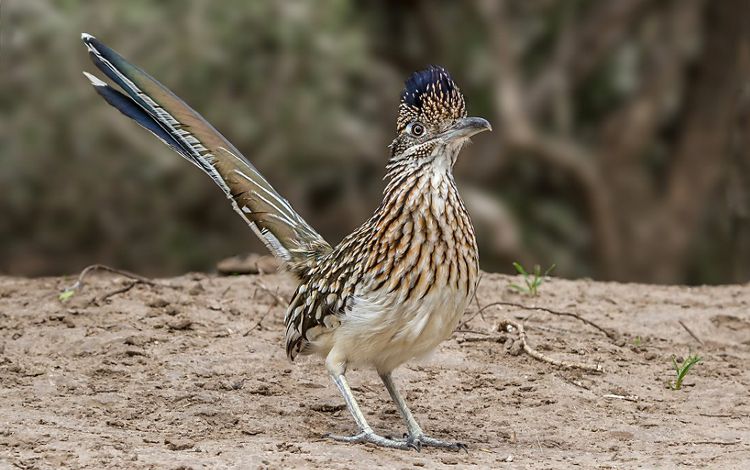 DID YOU KNOW? This quirky looking bird—with its tufted feather crest, long legs and zippy demeanor—is the largest member of the diverse cuckoo family. And it's a fearless predator that feasts on rodents, bats, other birds and even poisonous prey like scorpions and rattlesnakes. Greater roadrunners are well suited for the desert since they can lower their body temperatures at night and warm up in the morning by spreading their wings to expose their dark skin to the sun. This temperature regulation helps them conserve the energy they need for running down prey. They can fly short distances if they want to, but seem to prefer running. Greater roadrunners are also known for being flirtatious, with courtship rituals that include offers of twigs or food. When they mate, it is often for life.