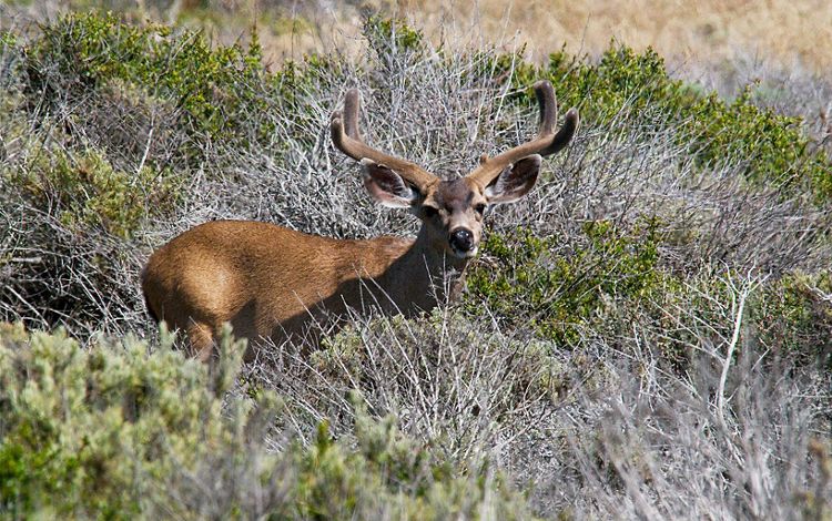 The burro deer is also known as the mule deer. Named for its long ears that resemble a burro’s, this deer hops with all four hooves hitting the ground simultaneously, quickly navigating rough terrain and escaping predators. This trademark running hop is called "stotting." Male deer are recognized by the antlers they grow each summer and fall and shed in the spring. The growth cycle of the antlers is regulated by changes in the length of the days throughout the year. Burro deer keep cool by keeping still during the hottest parts of the day, spending time in beds they make out of flattened grass. These deer also have no upper teeth, just a hard palate at the top of their mouth for grinding the forage they eat.