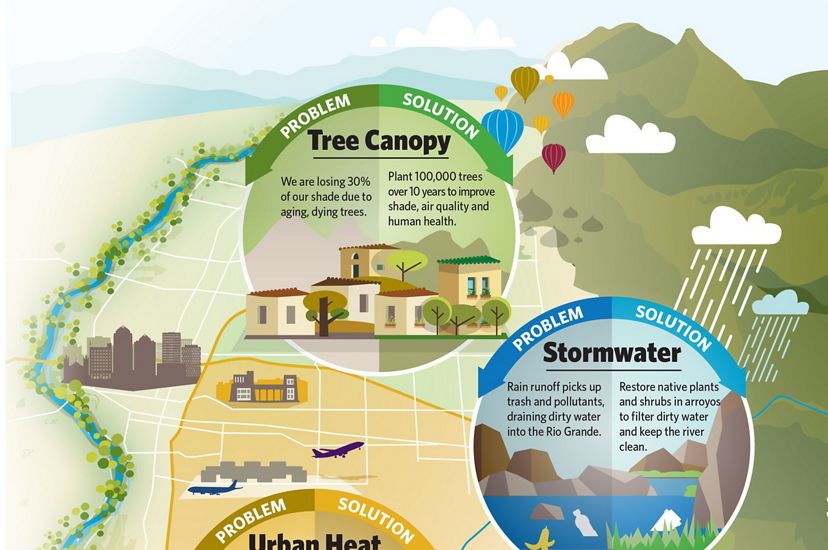 With a population approaching 600,000, Albuquerque offers opportunities to incorporate nature-based solutions. Examples could include managing storm-water runoff with natural areas, addressing “heat islands” by increasing urban tree canopy, and creating new wildlife corridors from the Rio Grande to the Sandia Mountains.