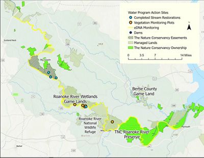 TNC has protected over 95,000 acres along the Roanoke, which is also part of the Sustainable Rivers Program. We work on improving water releases from dams, mimicking natural flow patterns to help fish spawning and water quality and restoring floodplains that have been altered by humans. We’re using cutting-edge tools to measure restoration effectiveness and lead the research on how to make dam operation decisions through a climate change lens.