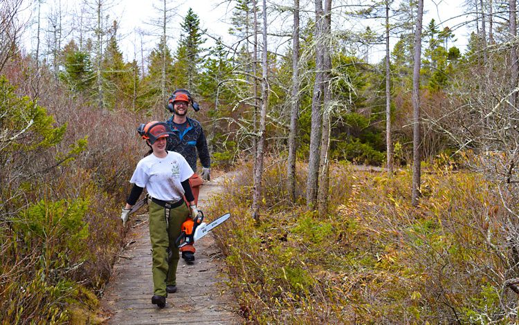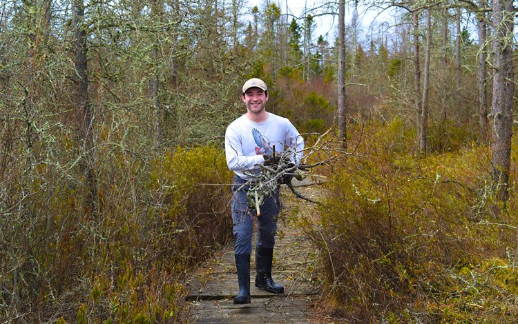 In the early spring of 2022, 2023 and 3034 TNC staff from Pennsylvania and Delaware—along with members of the chapter’s board of trustees, students from across the region and long-time TNC volunteers—spent a week clearing trees and shrubs from a portion of the Tannersville Cranberry Bog. The work involved cutting vegetation with chainsaws and loppers and then dragging cut material out of the bog. The brush was fed into a chipper and used as mulch on upland trails.