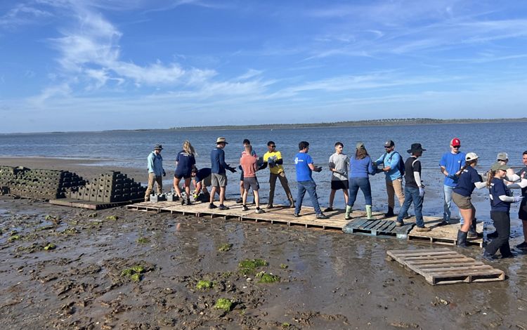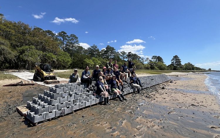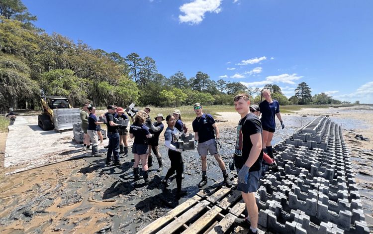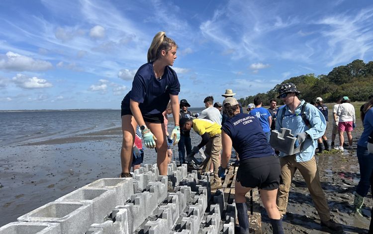 Living shoreline build, SC: 2025 Volunteers help restore an oyster reef at Marine Corp Airforce Base, Beaufort County, SC © Kyle Baskin