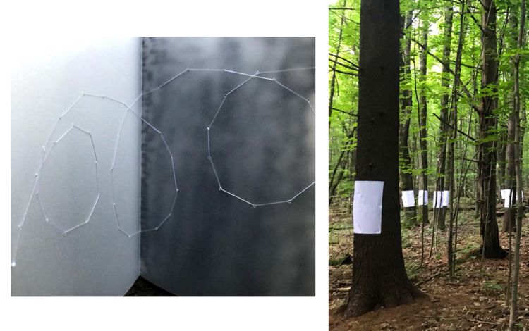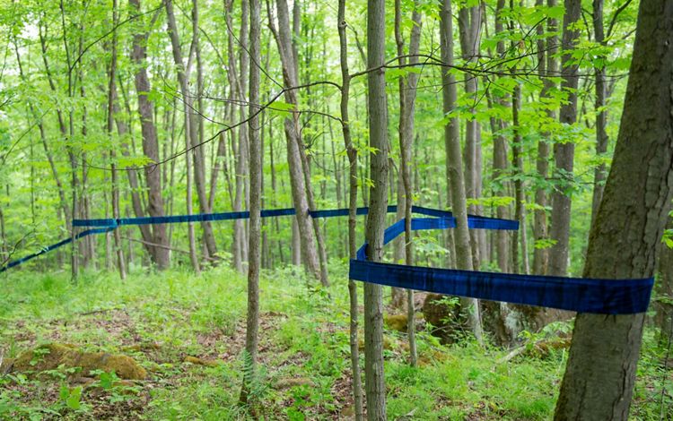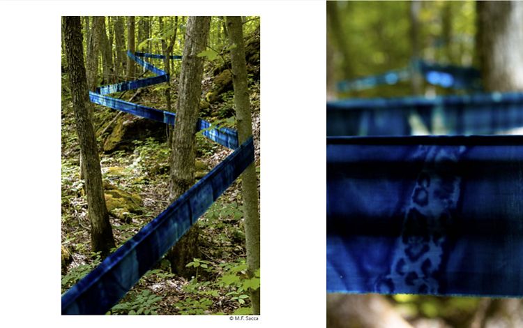 The cloth lines overlap, they drift along. The cyanotype blue bark lines are reminiscent of horizon lines, water currents, sap lines, or more than 1000’ of prayer flags fluttering in the wind, hovering above the ground, reverberating the landscape, and woven into the woods.