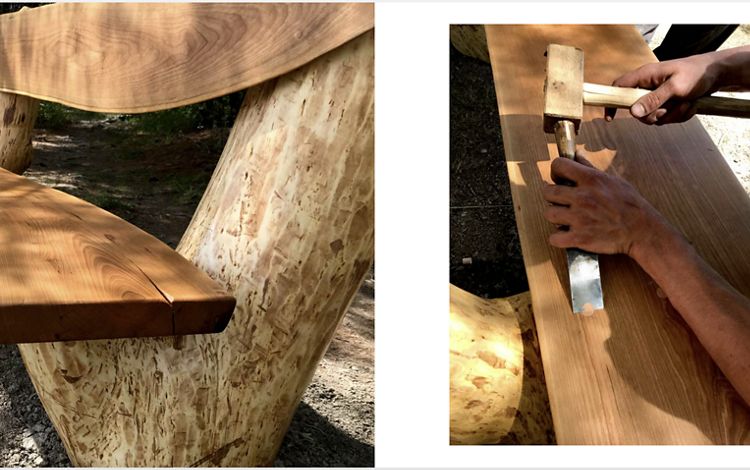 Mario then, took off with the idea, making the uprights for the bench out of tree crotches, curves in their own right. And working with the live edge of the boards for the plank seat and back. There is an ease with the abundance of curves, a harmony.