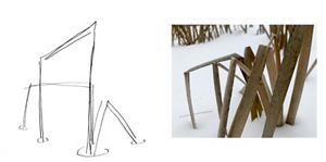 What began as a sketch, gained solidity on our kitchen table. After a heavy snowfall, I experimented with the shape and pathways using snowshoes. But the technicalities of translating the sketch have been swirling haphazardly around my thoughts