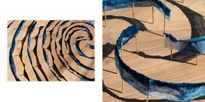 At LaPlatte River Marsh Natural Area, Billings worked with woodworker Mario Sacca to design and install a bench that echoes the curve of the river. Using tree crotches for the uprights and live-edge planks for the seat and back, Sacca created a bench that reverberates the bend in the river while providing a beautiful place to sit. Using tree bark as a departure point and the 180-year old photographic process of cyanotype, Billings created a cyanotype labyrinth that weaves itself in and out and among the tall trees at Equinox Highlands Natural Area. She carried the cyanotype method into her work at Raven Ridge Natural Area where water currents and horizon lines inspired a “blue ridge line,” accentuating the lines of the forest.