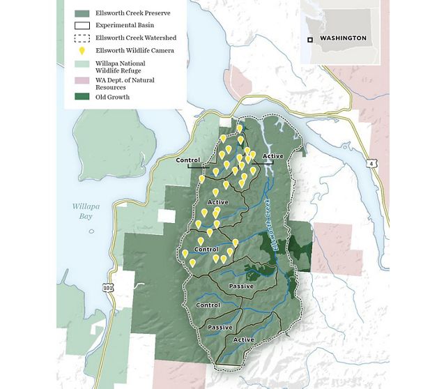 The camera locations were randomly selected in four of the eight experimental watershed basins of the preserve. Each basin is categorized based on the forest restoration method in use: control, passive restoration and active restoration. Control sites receive no restoration intervention, passive restoration sites have their roads removed, and active restoration sites receive tree thinning and additional planting of native plant species. The goal within active restoration sites is to accelerate the restoration of previously logged industrial timberland to old-growth characteristics, which can lead to thriving fish, wildlife and clean water.