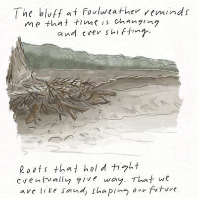 The bluff at Foulweather reminds me that time is changing and ever shifting. Roots that hold tight eventually give way. That we are like sand, shaping our future.