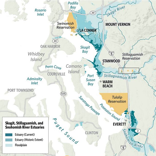 In Puget Sound, there is an extreme deficit of functioning estuary habitat that is severely impacting not just salmon but a host of other wildlife and the human communities that rely on them. To put it into perspective: the Skagit, Snohomish and Stillaguamish Deltas draining into the Whidbey Basin account for ~70% of Puget Sound’s historic delta habitat, yet only 31% of that acreage remains. With climate change, these remnant marshes are further squeezed between rising sea levels and the land.