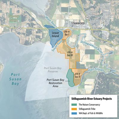 The Tribe’s 537 acre purchase, called zis a ba III, is the center puzzle piece connecting zis a ba I and II to its north and south, respectively. TNC’s Port Susan Bay property abuts the Tribe’s zis a ba II to its east. Both TNC and the Tribe identify these lands and waters as critical for Chinook salmon populations, co-stewarding habitat restoration of tidal wetlands together. These efforts will have significant impact on nearby Indigenous communities along the North Puget Sound. Furthermore, reconnecting these waterways supports reestablishing Stillaguamish land sovereignty.