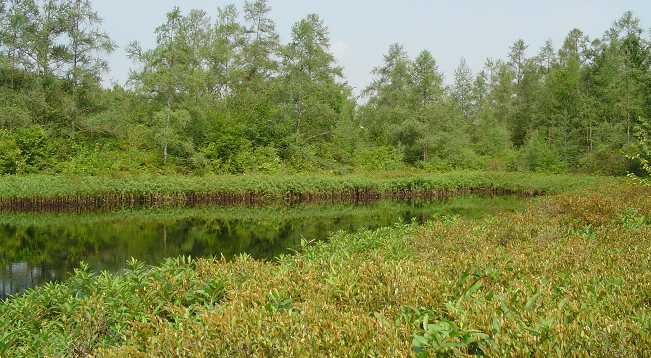 Flatiron Lake Bog is a rare classic tamarack-ringed bog. It is an acid, kettle-hole bog that displays the classic ringed zonation of bog plant communities. Furthest out are the upland kame ridges surrounding Flatiron Lake that are covered by mature oak-maple forests. The forest zone grades into the next zone of a tall shrub community dominated by highbush blueberry. The tall shrub zone then grades into a tamarack woods, then a shrub zone and floating sphagnum mat and finally an open pool in the center.