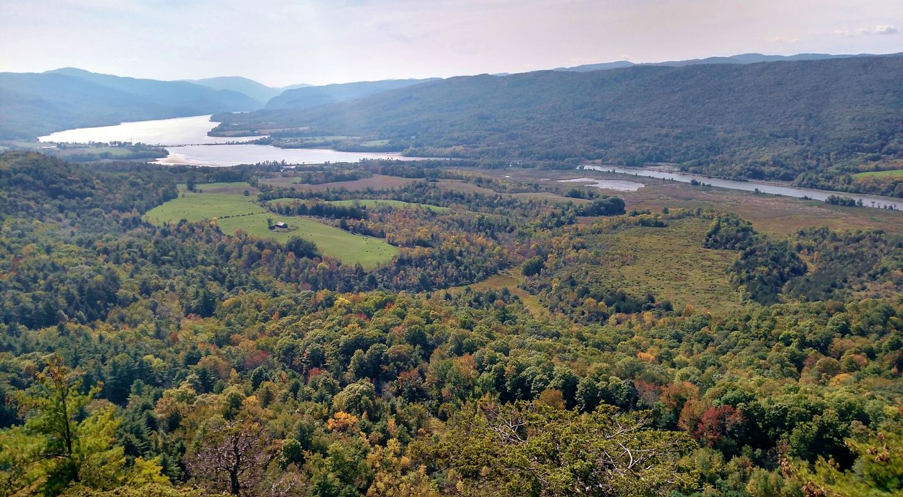 From the fields of the old Galick farmstead, there is a sweeping vista of mountains, wetlands and the southern end of Lake Champlain. Bald Mountain rises out of the hayfields like a whale emerging from the deep. The river-like southern end of Lake Champlain and its wetlands trail below, while the South Bay and Saddles Mountain in New York lie beyond the mountain.