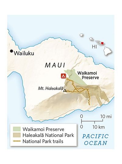 The trail begins in the adjacent Haleakala National Park and drops into the preserve, winding through gulches in the upper reaches of the cloud forest, where lavender-flowered Lobelia grayana sprouts from the floor. The forest canopy—dominated by the native ‘ohi‘a tree and an under-story rich with moss and ferns—is a bird-watcher’s dream and a prime place to spot the ‘amakihi and scarlet ‘i‘iwi. The preserve is only open to the public for one guided trip per week, so get your name on the list early.
