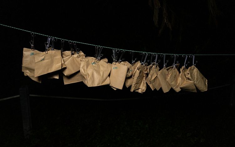 Back at Bellamy, it’s almost 10 p.m.; headlamps illuminate five tables strewn with glue bottles and data clipboards. “We have 15 minutes before we have to release,” calls Holliday. Bags still hang from the clothesline, far too many bats to process as the minutes fly.