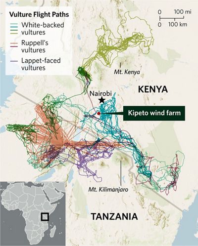 As interest in local wind development grew, the International Union for Conservation of Nature in 2015 classified two local bird species—the white-backed vulture and Ruppell’s griffon vulture—as critically endangered. These large birds serve as the cleanup crews for Kenya’s vast open landscapes, and they are built for this task: They spend most daylight hours circling high over the savannas; they have excellent vision at long distances, and their bodies are adapted to survive in the low-oxygen atmosphere of high altitudes. They descend to feed on carrion, the carcasses of dead animals. Their heads are bald to regulate their body temperature and prevent germs from collecting in feathers as they dissect each meal, and their digestive systems are adapted to process rotting flesh and organs.