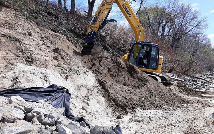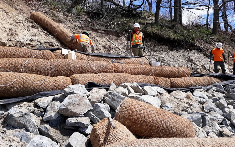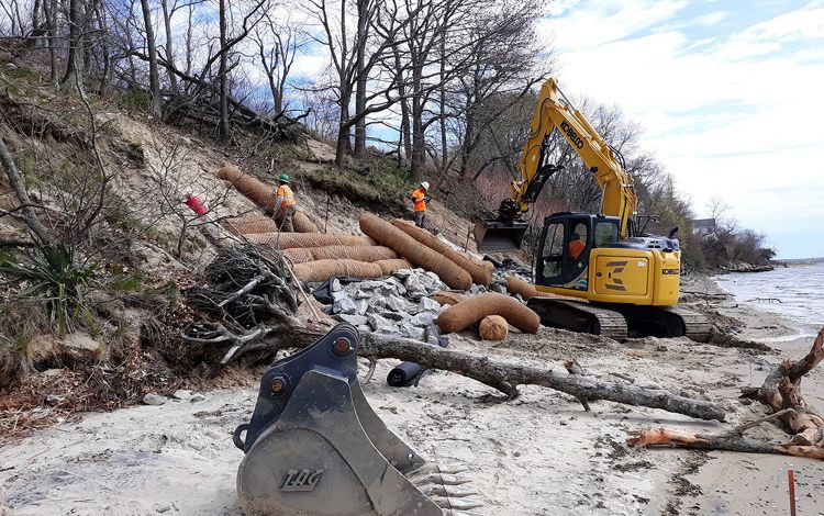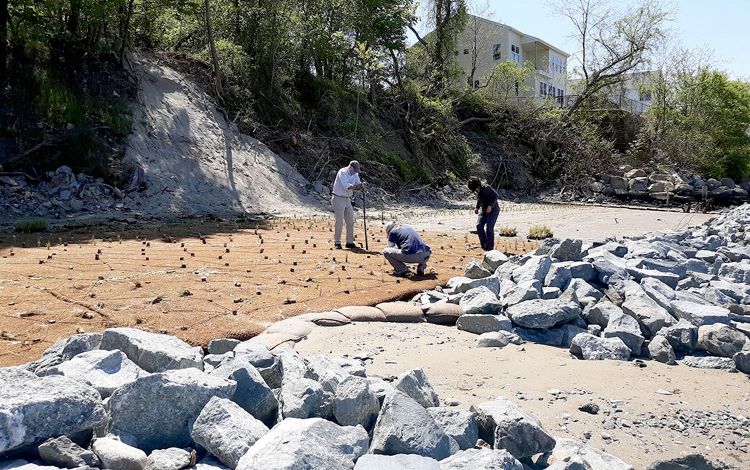 Construction of a hybrid bluff structure started in late April 2020 and was completed in mid-May of that year; marsh was planted in mid-May. Bluff construction included preparing the bank (removing trees and regrading) and installing a stone toe, above which 13 rows of coir logs were positioned and anchored in place. A sand cover and coir blanket were installed on top of the coir logs to shield them from UV light. The coir structure was planted with American beach grass (Ammophila breviligulata).