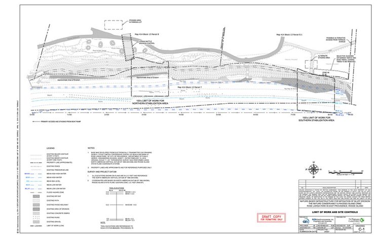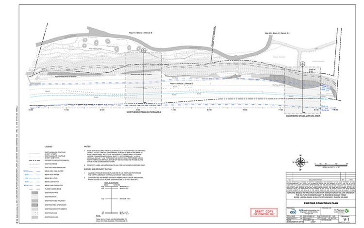 Most of the Narragansett Bay shoreline adjacent to the Rosa Larisa Park in East Providence is a sandy coastal bluff vegetated with trees. The bluff runs north-south for approximately 850’. The wave and wake energy generated from the waters of Narragansett Bay were undercutting the bluff and this was further exacerbated by overtopping trees. This shoreline erosion was encroaching on the City’s parkland. The project partners looked at the potential of using limited funding to test several living shoreline bluff restoration practices at this site—practices that could be used to eventually complete erosion control on the entire site as well as be transferable to other locations requiring coastal bluff erosion control.