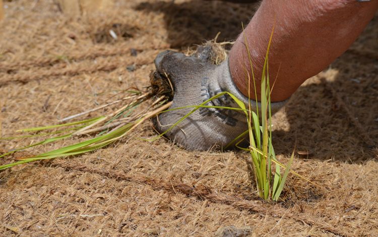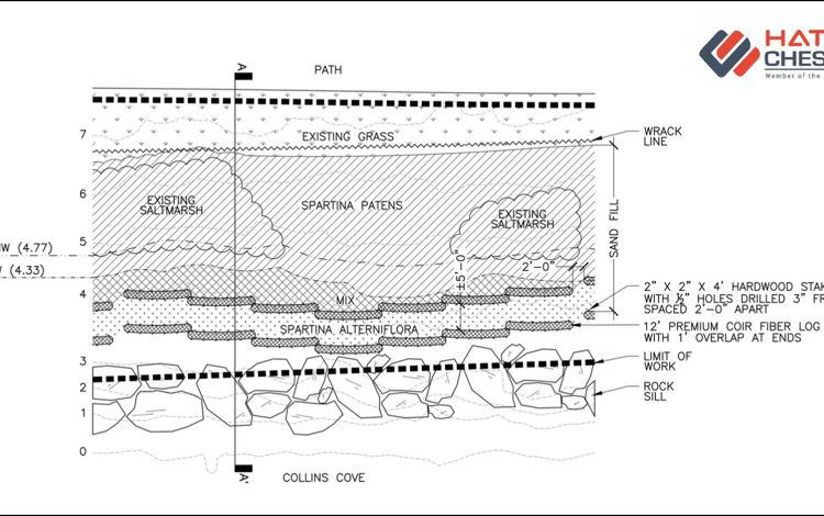 A continuous coir log was installed at the high marsh–low marsh elevation. Plants that had been grown the previous year were installed as turfs. Fifteen hundred of these plants were purchased, and 10,000 of them were supplied by the turf grower.