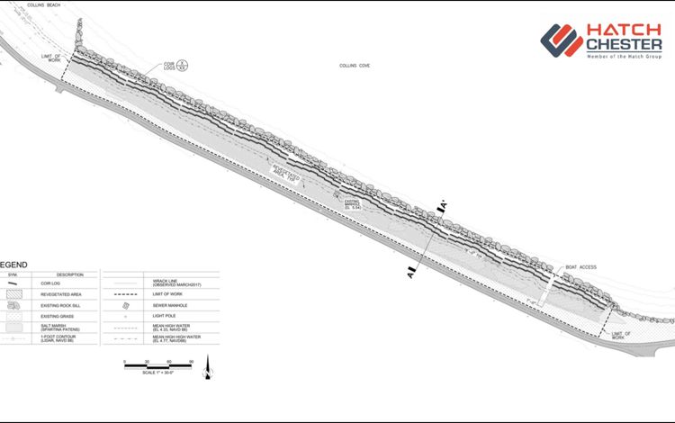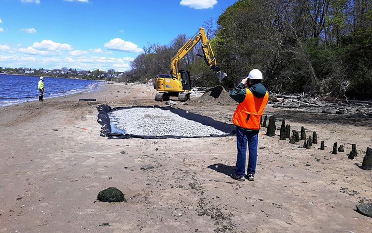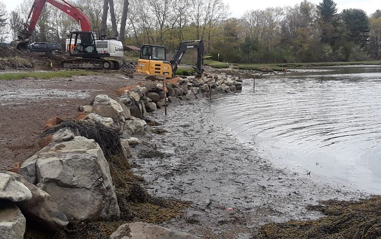 Construction began in April 2017 when a temporary access road for heavy equipment vehicles was built. A portion of rock sill made of reused stone and root wads was built, and marsh was planted behind it for sediment and erosion control. This sequence was repeated until the earthwork and sill were complete. Some of the sediments were imported, while some were acquired from the town.