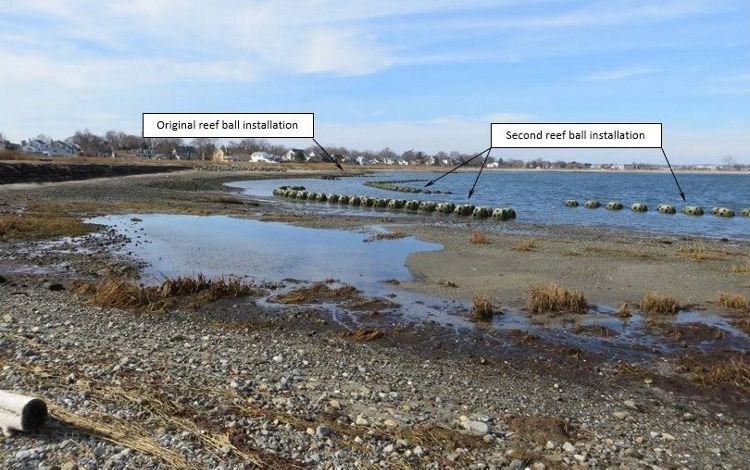 In November 2016, the project was expanded to stabilize and enhance an additional 750 linear feet of shoreline. The expanded living shoreline consists of four additional segments of reef balls oriented parallel to the existing shoreline. Segments range in length from approximately 150 to 250 feet, with overlapping ends to reduce edge effects and associated scour, a concern that emerged after observing localized erosion on the periphery of the original pilot reef ball arrays. Overlap was achieved by having two segments located closer to shore and two segments located farther from shore. Distance from shore was selected to correspond to the seaward extent of the historical marsh at the site. The segmented placement of reef ball arrays, rather than in a continuous line, facilitated tidal exchange and allows for the passage of marine fish and invertebrates like the horseshoe crab (Limulus polyphemus).