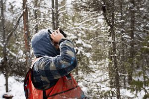 A winter scene where a forester takes off his gloves and sits next to a hole in the frozen body of water.