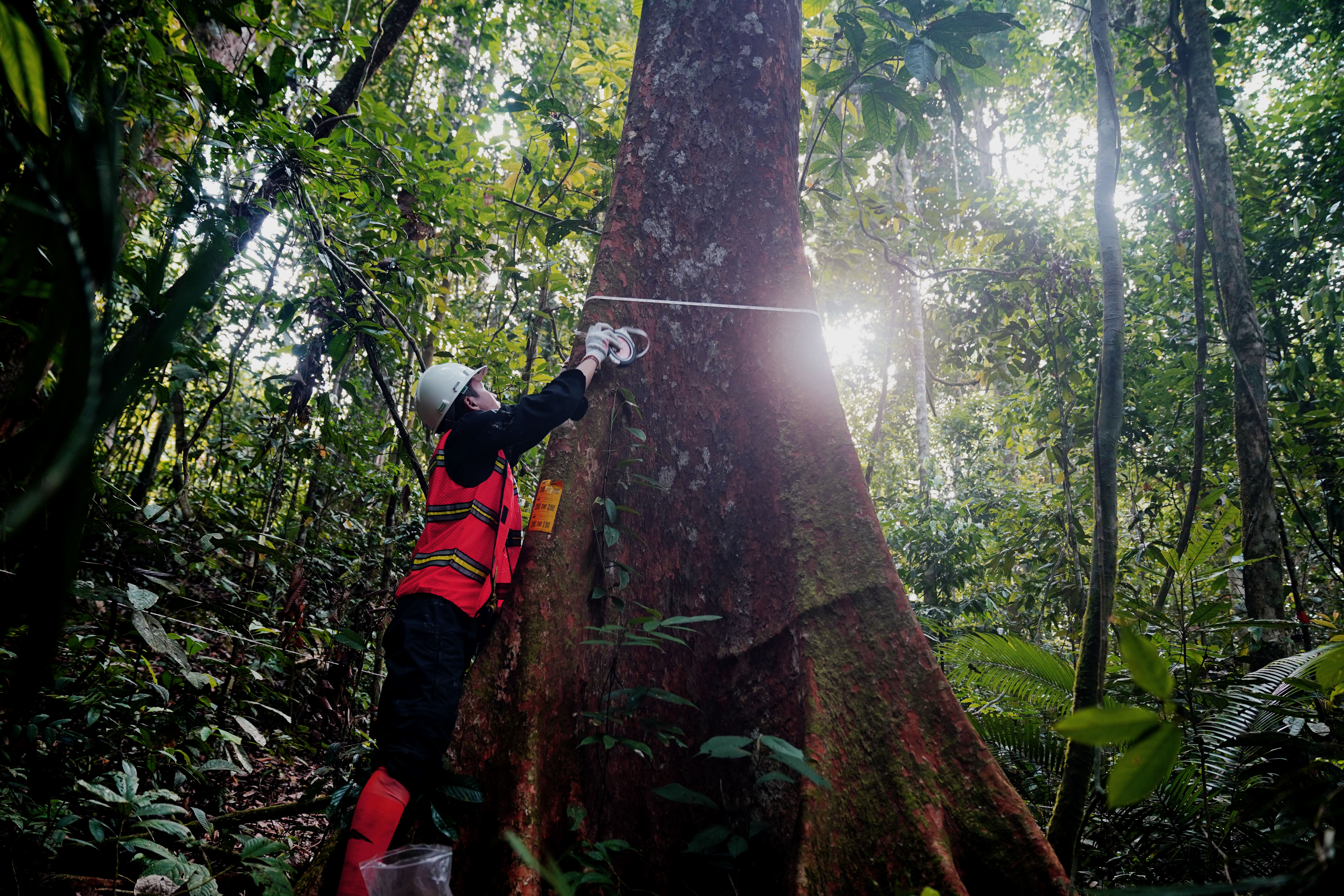Carbon monitoring Measuring the circumference of a tree trunk as part of carbon monitoring in a forest in Indonesia’s Berua District. © Bridget Besaw © Bridget Besaw