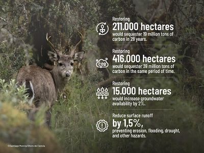 Restoring 211,000 hectares would sequester 19 million tons of carbon in 28 years. Restoring 416,000 hectares would sequester 39 million tons of carbon in the same period of time. Restoring 15,000 hectares would increase groundwater availability by 2 percent. Reduce surface runoff by 1.5 percent, preventing erosion, flooding, drought, and other hazards.