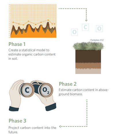This graphic contains descriptions of three phases. Phase 1: Create a statistical modal to estimate organic carbon content in soil. Phase 2: Estimate carbon content in above-ground biomass. Phase 3: Project carbon content into the future.
