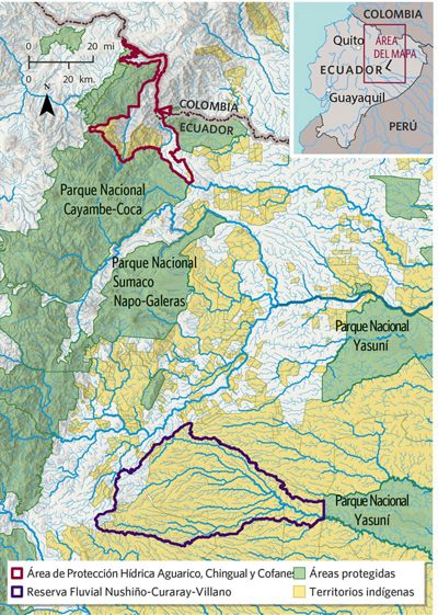 En respuesta, el gobierno ecuatoriano se asoció con TNC, con el apoyo de Conservación Internacional y Andes Amazon Fund, para establecer un conjunto de cinco áreas de protección hídrica hasta principios de 2023. El texto de la Constitución de Ecuador de 2008 y la Ley Orgánica de Recursos Hídricos, Usos y Aprovechamiento del Agua (LORUyA) de 2014 proporcionaron el marco jurídico para dar prioridad a los ecosistemas de agua dulce.