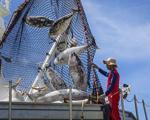 Allí, unas 280 embarcaciones, algunas de ellas casi tan largas como un campo de fútbol y ayudadas por helicópteros que detectan los bancos de peces, emplean redes colosales para atraparlo. Cada año, esta flota de pesca con redes captura la mayor parte de los casi 3 millones de toneladas métricas de pescado que se extraen, por un valor que asciende a casi 7000 millones de dólares.