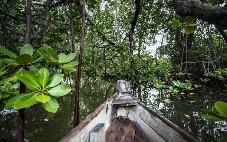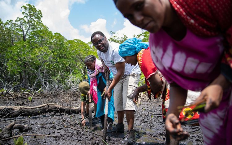 Tal vez tengas que mirar el fango más atentamente para ver los delgados y verdes propágulos que salen del suelo. Mujeres en hijabs y kangas multicolores están inclinadas cuidando estas preciosas semillas y sus brotes. Después de un par de años, crecerán y se convertirán en mangles adultos, con estructuras radiculares visibles sobre y debajo de la superficie del agua.