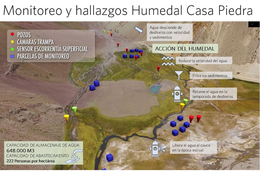 Las mediciones constantes permitieron constatar que el humedal Casa Piedra actúa a la vez como filtro, reteniendo los sedimentos del agua que desciende de la cordillera y filtrándola en su camino al embalse de El Yeso; y también como esponja, reteniendo con su suelo y vegetación estas aguas en primavera, y liberándolas a la cuenca en la época estival (enero a marzo), cuando más se necesita.
