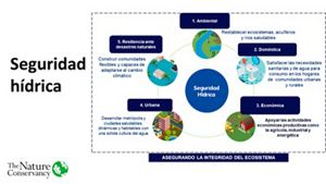 - Creación y fortalecimiento de Fondos de Agua en Colombia: Con recursos de cooperación del Banco Interamericano de Desarrollo, la Cooperación del Gobierno de la República de Alemania, la Fundación FEMSA y la Fundación Mario Santodomingo, TNC apoyó el fortalecimiento institucional de los fondos de agua de Bogotá, Medellín, Cali, Valle del Cauca, Bucaramanga, Cartagena, Santa Marta y Ciénaga, Manizales y Cúcuta. Esta cooperación consiste en apoyo financiero para la secretaria técnica de los fondos de agua, planeación estratégica y financiera, comunicaciones y diseño de sistemas de monitoreo. Así mismo, TNC apoya con capacitación a dichos fondos, materializada en eventos nacionales e internacionales sobre temáticas relacionadas con seguridad hídrica.